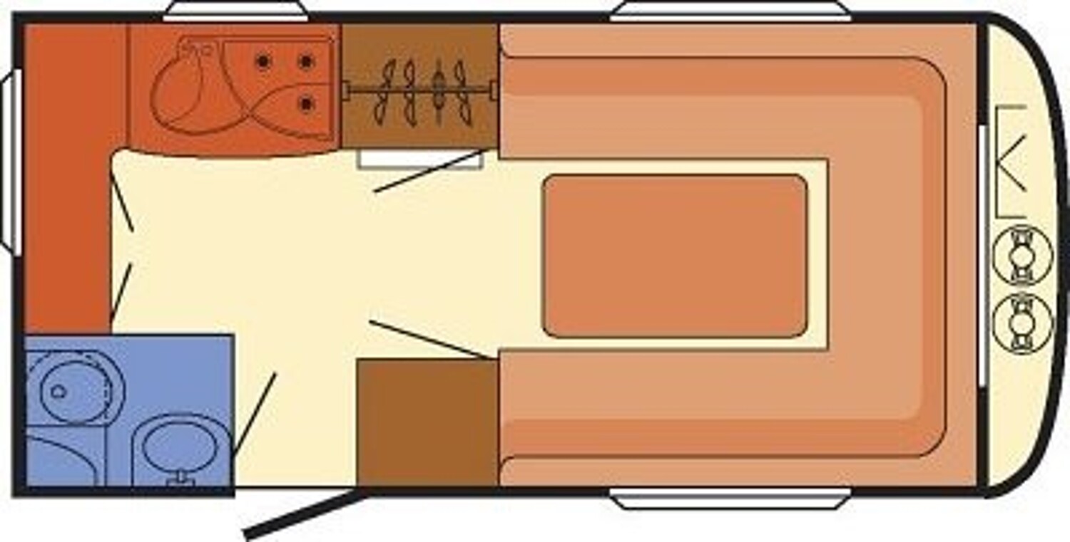 - Der Wagen hat eine große Rundsitzgruppe im Bug sowie eine schöne L-Küche im Hech links sowie Toilettenraum im Heck rechts.