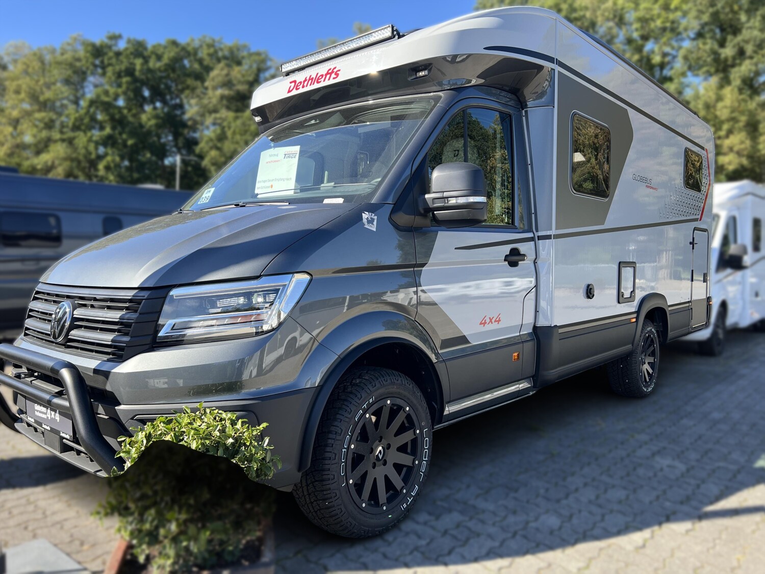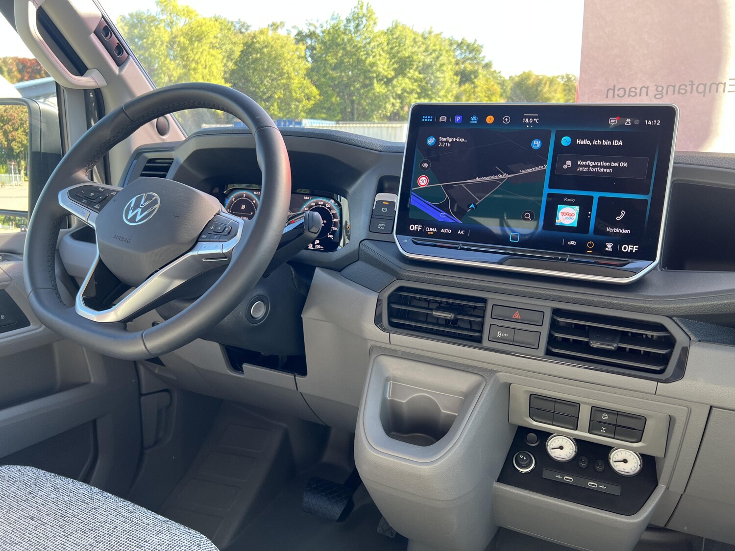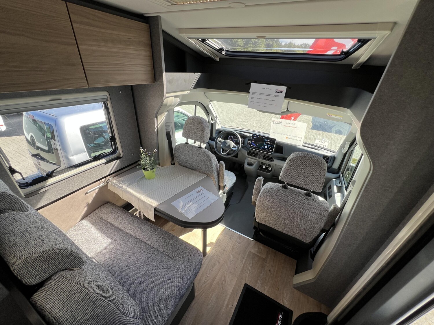 - First Edition Paket (Alufelge Hanma 18 Zoll schwarz matt, LoderTire AT 255/55 R18 (M+S Schneeflocke) inkl. Radkastenabdeckung VA, Höherlegung Vorder- und Hinterachse, LED Lightbar T-Haube, Verdunklungsjalousien im Fahrerhaus, Wohnraumtür mit Fenster inkl. Verdunkelung und Zentralverriegelung (inkl. Fahrerhaustür), Dachlüfter mit Ventilator, Doppelverglaste Rahmenfenster mit Verdunklung & Mückenschutz, Cassettenmarkise Omnistor 4.0 m inkl. LED Beleuchtung (manuell), Dachreling, Aufstiegsleiter für Dachreling inkl. Querträger, 2. Aufbaubatterie Dual Battery System (Lithium), 168 Ah, Light Moments: Indirekte Ambientebeleuchtung über den Dachstauschränken, Light Moments: Indirekte Wandflächen-Ambientebeleuchtung, Light Moments: Verkleidete Sitztruhenwange mit indirekter Beleuchtung, Light Moments: Fensterverkleidung im Wohnraum beleuchtet, Light Moments: Küchenrückwand beleuchtet, 5G WLAN Router inkl. 4×4 Dachantenne mit 32 Smart TV inkl. Flachbildschirmhalter, Raumhoher Kompressor Kühlschrank mit separatem Frosterfach (131 l), FirstEdition Außendesign (Bi-Color lackierung T-Haube, schwarze Kantenleisten), Außenlackierung Aufbau: Grau, Außenfarbe Chassis: Indiumgrau Metallic, Klimaanlage AirCare Climatic, LED-Hauptscheinwerfer mit LED-Tagfahrlicht, Licht- und Sicht-Paket, Vorbereitung für VW Connect und VW Connect Plus, Außenspiegel el. verstell- und beheizbar und integriertem Blinker, Assistenzpaket Advanced inkl. automaitscher Distanzregelung (ACC), intelligenter Speed-/ Travel-/ Lane-Assist, Navigationssytem Discover Pro mit 12″ Touch-Farbdisplay, Differentialsperre, Berganfahrhilfe / Abfahrhilfe, Handschuhfach abschließbar und beleuchtet)