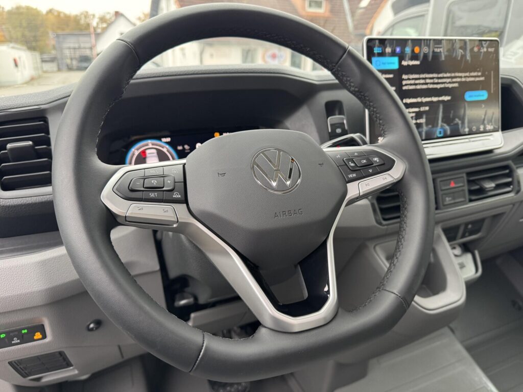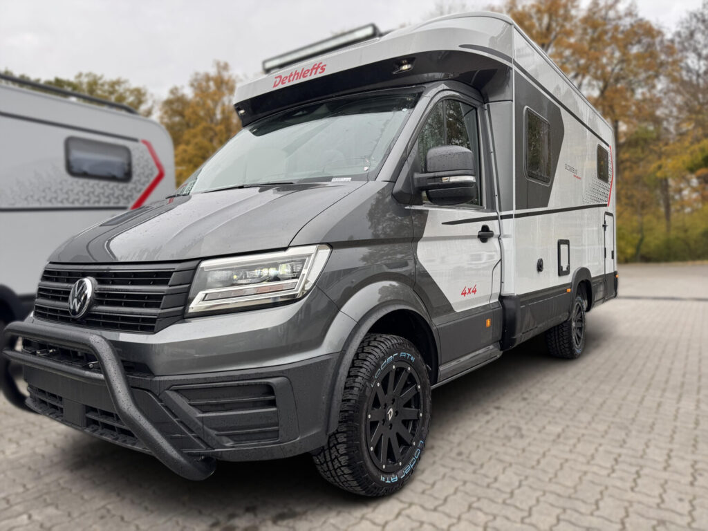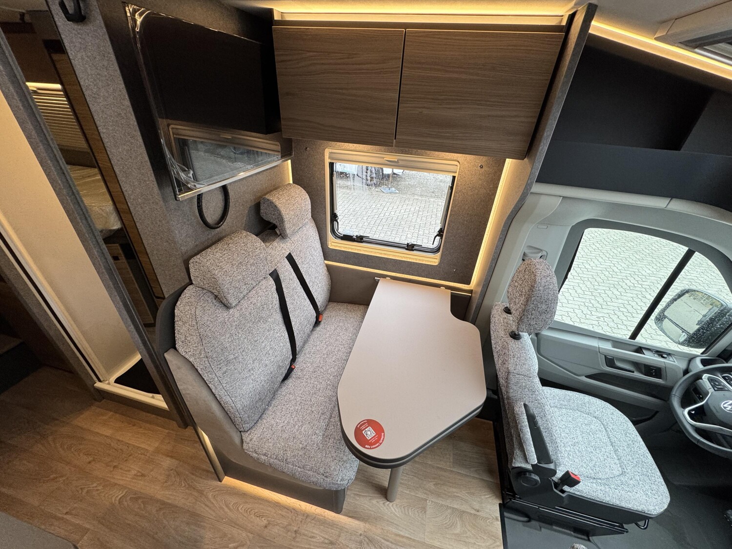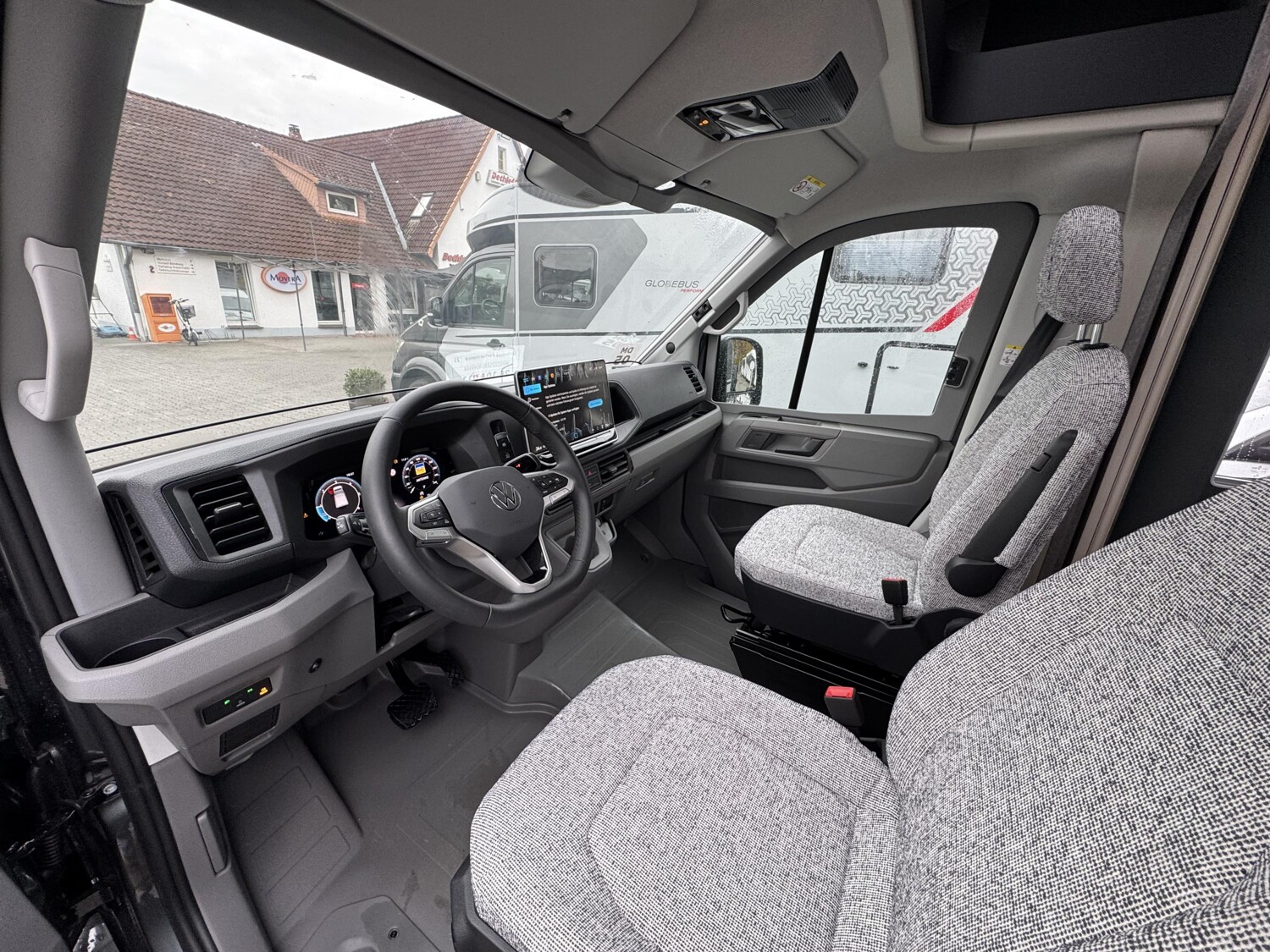 - First Edition Paket (Alufelge Hanma 18 Zoll schwarz matt, LoderTire AT 255/55 R18 (M+S Schneeflocke) inkl. Radkastenabdeckung VA, Höherlegung Vorder- und Hinterachse, LED Lightbar T-Haube, Verdunklungsjalousien im Fahrerhaus, Wohnraumtür mit Fenster inkl. Verdunkelung und Zentralverriegelung (inkl. Fahrerhaustür), Dachlüfter mit Ventilator, Doppelverglaste Rahmenfenster mit Verdunklung & Mückenschutz, Cassettenmarkise Omnistor 4.0 m inkl. LED Beleuchtung (manuell), Dachreling, Aufstiegsleiter für Dachreling inkl. Querträger, 2. Aufbaubatterie Dual Battery System (Lithium), 168 Ah, Light Moments: Indirekte Ambientebeleuchtung über den Dachstauschränken, Light Moments: Indirekte Wandflächen-Ambientebeleuchtung, Light Moments: Verkleidete Sitztruhenwange mit indirekter Beleuchtung, Light Moments: Fensterverkleidung im Wohnraum beleuchtet, Light Moments: Küchenrückwand beleuchtet, 5G WLAN Router inkl. 4×4 Dachantenne mit 32 Smart TV inkl. Flachbildschirmhalter, Raumhoher Kompressor Kühlschrank mit separatem Frosterfach (131 l), FirstEdition Außendesign (Bi-Color lackierung T-Haube, schwarze Kantenleisten), Außenlackierung Aufbau: Grau, Außenfarbe Chassis: Indiumgrau Metallic, Klimaanlage AirCare Climatic, LED-Hauptscheinwerfer mit LED-Tagfahrlicht, Licht- und Sicht-Paket, Vorbereitung für VW Connect und VW Connect Plus, Außenspiegel el. verstell- und beheizbar und integriertem Blinker, Assistenzpaket Advanced inkl. automaitscher Distanzregelung (ACC), intelligenter Speed-/ Travel-/ Lane-Assist, Navigationssytem Discover Pro mit 12″ Touch-Farbdisplay, Differentialsperre, Berganfahrhilfe / Abfahrhilfe, Handschuhfach abschließbar und beleuchtet)
