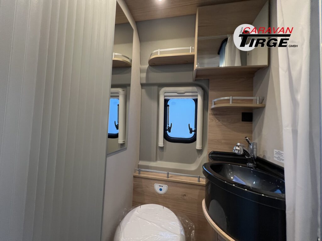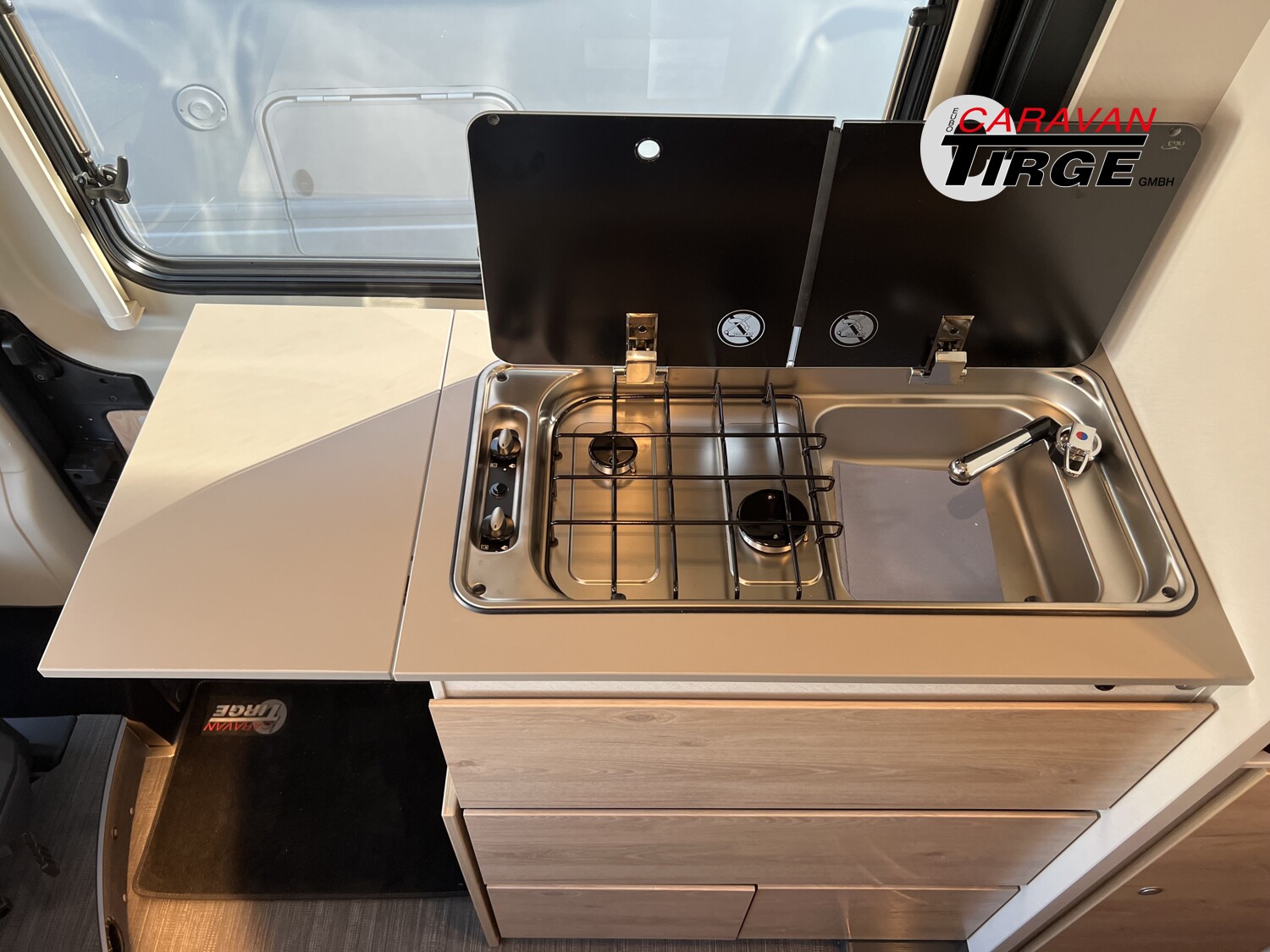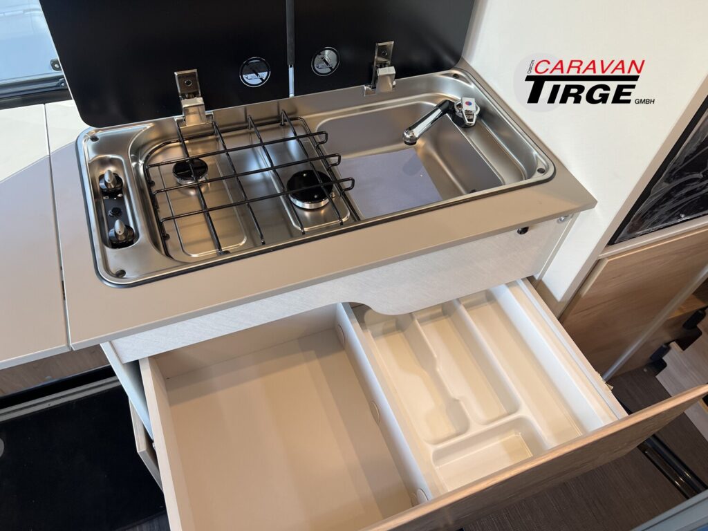- Elektro Paket (Zusätzliche Doppel-USB-Steckdose im Bug links, 12-V-Steckdose im Heckbereich links unten, 230-V-Steckdose im Oberschrank Bug links (Sitzgruppe), Indirekte Beleuchtung, LED-Lichtröhre in der Küche, Vorbereitung Solarmodule)