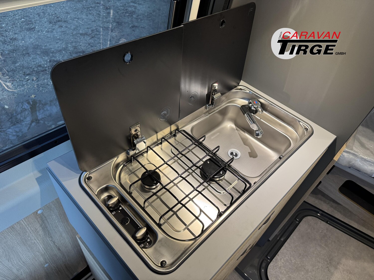- Fenster mit Fliegenschutz und Verdunklungsrollo im Heck rechts