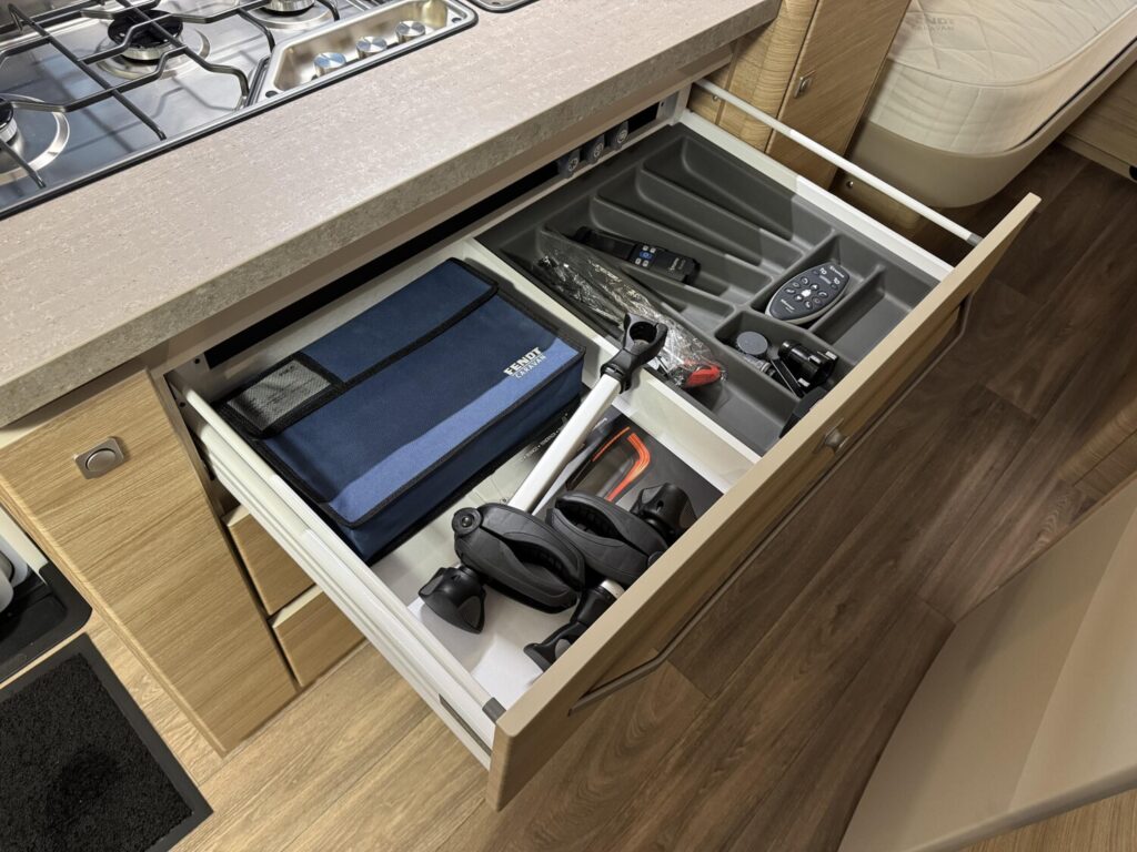 - Li-Fe Batteriepaket I (30 Ah) (Laden mit 230V, in der Batterie integriert, Batteriehauptschalter, PowerXterme, Li-Fe Batterie 30 Ah mit integriertem BMS (= Batteriemanegement System) mit Bluetooth, Statusabfrage per APP, Integrierter Tiefentladeschutz in der Batterie, Spezielle Schaltung für autarke Stromversorgung der serienmäßigen 12V Verbraucher (ohne Kühlschrank))