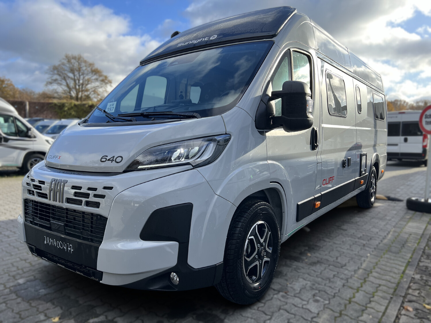 - Cliff X Ausstattung 640 (Fiat Ducato 3.500 kg | 2.2 Multijet | 103 kW | 140 PS Euro 6 | 6-Gang-Schaltgetriebe, Fiat Weiß, Adventure Beklebung, Wohnwelt Adventure, LED Beleuchtung Dachschrank, Dachstauschrank Heck umlaufend, Skyview, Rahmenfenster, Variobad, Markise (schwarz), Panoramadachhaube 70 x 50 cm, Duschausstattung (Brausekopf ausziehbar, Duschvorhang, Führungsschiene, Brausehalter), Fenster im Bad, Kleiderstange in der Nasszelle, Breite Einstiegsstufe, Drehplatte für Tischerweiterung an der Sitzgruppe, Stoßfänger lackiert, Skid Plate Schwarz, Nebelscheinwerfer, Lenkrad & Schaltknauf in Lederausführung, Luftauslässe mit Applikationen Silber (Techno-Trim), 16″ Alufelgen Bi-Color)